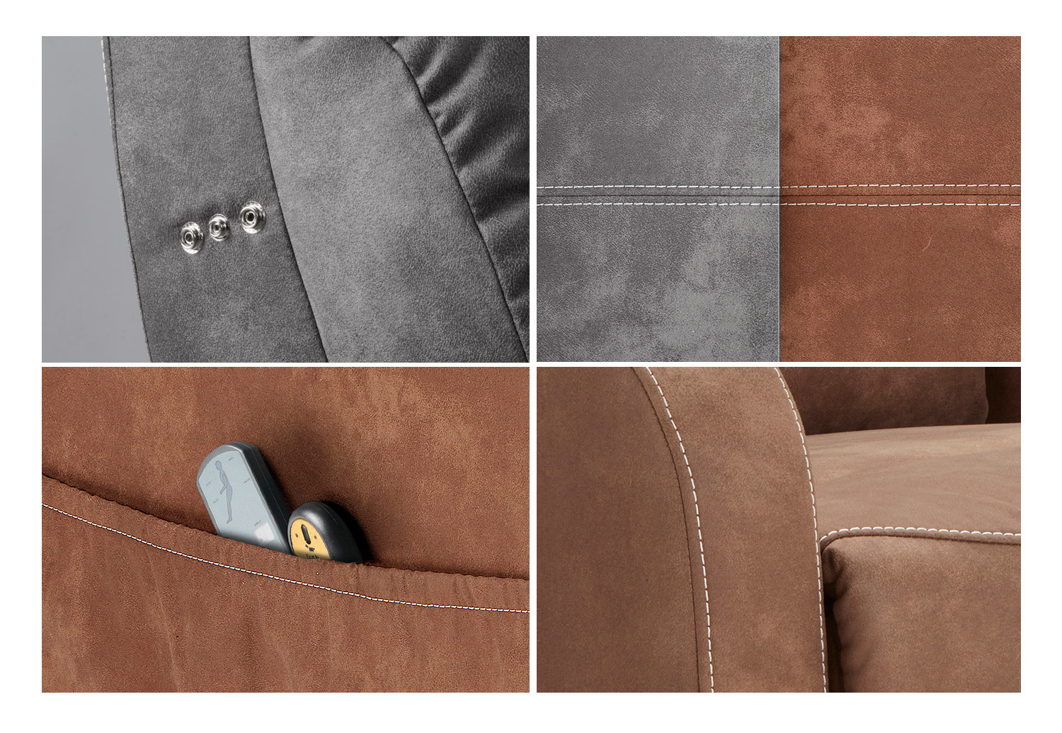 - Material: FULL PU (color Negro o Chocolate) o tejido microfibra (color Brown o Grey).