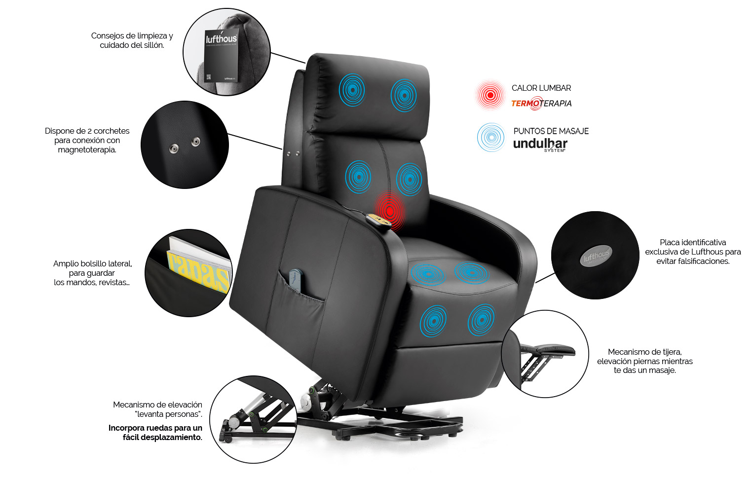 Además, ahora cuenta en su composición con tejido técnico Tech Fabric, que ayuda a la eliminación de la electricidad estática, y una novedad única en el mercado que solamente encontrarás en los sillones de Lufthous®: conexión para equipos de magnetoterapia.